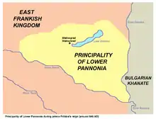 В 833 году Прибина был изгнан из Нитры великоморавским князем Моймиром I и бежал в земли франков. Король Восточно-Франкского государства Людовик II Немецкий крестил Прибину и пожаловал ему паннонскую часть Каринтийской марки[1] вокруг Балатона. На берегу этого озера Прибина построил Блатноград (ныне Залавар, Венгрия), ставший столицей Блатенского княжества.
