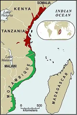 ![]() Экорегион выделен красным цветом. Зелёным цветом выделены прибрежные леса Южного Занзибара-Иньямбане. | |
