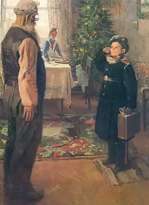 14 декабря 2013 года на территории Санкт-Петербургского суворовского военного училища (улица Садовая, 26) открыт памятник выпускникам суворовских училищ и кадетских корпусов. Скульптурная композиция воссоздаёт сюжет картины «Прибыл на каникулы»: маленький военный докладывает деду; герои памятника имеют и портретное сходство со своими прототипами. Памятник скульптора Карэна Саркисова установлен здесь по инициативе командующего войсками Западного военного округа Анатолия Сидорова, который сам окончил суворовское училище, и в ознаменование 70-летия суворовских и нахимовских училищ в России[9][10][11].