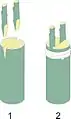 Прививка побега: 1 — В разрез в стебле подвоя вставляется побег привоя, у которого удалена кора; 2 — ткани привоя и подвоя находятся в тесном контакте