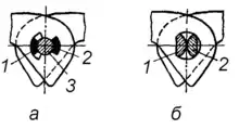 Зубчатые цепи различаются по конструкции шарниров. В них используют шарниры скольжения, в которых вкладыши 1 и 2, закреплённые в пластинах на всей ширине цепи, контактируют с валиком 3. Шарнир допускает поворот пластин в две стороны на угол φ = 30°. Шарниры качения не имеют валика, их изготовляют с двумя сегментными вкладышами 1 и 2. При взаимном повороте пластин вкладыши не скользят, а перекатываются, что позволяет повысить КПД передачи и долговечность цепи.