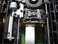 - в узле головки размещены лазерный излучатель, на основе инфракрасного лазерного светодиода, система фокусировки, фотоприемник и предварительный усилитель. Система фокусировки представляет собой подвижную линзу, приводимую в движение электромагнитной системой voice coil (звуковая катушка), сделанной по аналогии с подвижной системой громкоговорителя - изменение напряженности магнитного поля вызывают перемещение линзы и фокусировку лазерного луча.