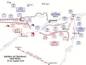 Также ожесточенные бои развернулись в междуречье Самбры и Мааса у бельгийского города Шарлеруа. Здесь 5-я французская армия противостояла 2-й и 3-й германским армиям. 21 августа части 2-й германской армии захватили несколько переправ на Самбре и 22 августа форсировали её крупными силами. Затем развернулись ожесточенные бои, сначала французы попытались перейти в наступление, затем немцы атаковали ряд переправ на Маасе, но эти действия не принесли результатов атаковавшим[17].