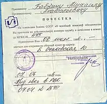 - Soviet Conscription. Сайт GlobalSecurity.org. — см. абзац «In 1982 education exemptions…»; взятка за отсрочку составляла около 1 тыс руб. (это полугодовой доход опытного инженера). Дата обращения: 2 мая 2020.