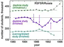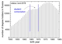 На графике числа специалистов, выпущенных дневными отделениями вузов РСФСР—России, видны спады 1987 года (не закончили вовремя обучение попавшие под первый, 1983 г., студенческий призыв в ВС) и 1989 года (не выпустились попавшие под ужесточение призывной политики с 1985 г.). Для выпуска вечерников-заочников подобных особенностей нет. Ещё заметен пик 1993 года (результат увольнения-89); он, однако, не перекрывает значений начала 1980-х и даже не достигает их, поскольку далеко не все доходили до диплома. При этом приём на дневную форму занятий в 1980-е гг. оставался стабильным, то есть недовыпуск периода 1987—1994 гг. превысил обычные потери от «недоучиваемости» примерно на 300 тысяч. Предполагая, что, при сохранении отсрочки, выпуск в тот период монотонно снижался бы ввиду экономических причин от уровня начала 1980-х гг. (когда призыв ещё не влиял) до уровня 1995 г. (когда уже не влиял), потери кадров в РФ за счёт фактора службы следует оценить как 150—200 тысяч.