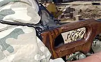 - Стандартный приклад с пистолетной шейкой. Верхняя сторона этого приклада прямая, а нижняя имеет ярко выраженную пистолетную рукоятку.
