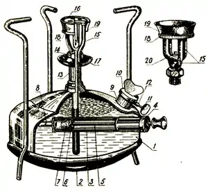 - Заправлять примус горючим следует только после того, как он полностью остынет. После заправки горючим необходимо плотно закрыть наливной люк.