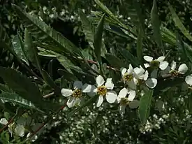 Цветки обоеполые, собраны на концах двулетних веток в кистевидные соцветия по 1—8 (иногда до 13). Чашечка разделена на пять коротких и широких, нередко неравных долей. Венчик состоит из пяти равных свободных округлых лепестков белого или светло-жёлтого цвета. Тычинок обычно не менее 10. Завязь верхушечная.
