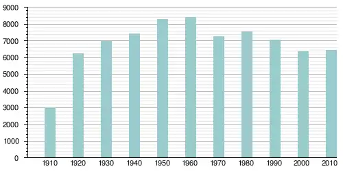 Население города по возрастному диапазону по данным переписи 2010 года распределилось следующим образом: 19,4 % — жители младше 18 лет, 3,4 % — между 18 и 21 годами, 56,5 % — от 21 до 65 лет и 20,7 % — в возрасте 65 лет и старше. Средний возраст населения — 42,6 года[1].
