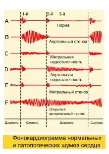 - пресистолический шум — возникает в конце диастолы за счёт активной систолы предсердий; имеет нарастающий характер, исчезает при мерцательной аритмии