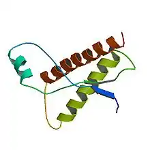 В пространственной структуре PrP выделяют неструктурированный N-концевой участок (а. о. 23—125 у человека) и глобулярный домен (а. о. 126—231), состоящий из трёх α-спиралей и двухцепочечного антипараллельного β-листа[26][27].