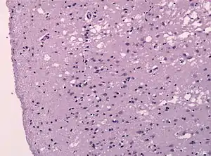 ![]() Гистологический препарат — ткань лобной доли головного мозга больного болезнью Крейтцфельдта — Якоба | |