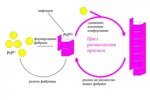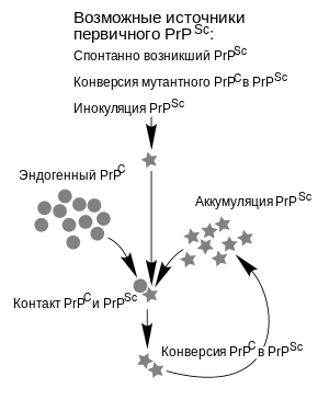 Инфекционная изоформа PrP — PrPSc — способна превращать нормальный белок PrPC в инфекционную изоформу, изменяя его конформацию (то есть третичную структуру); это, в свою очередь, изменяет взаимодействия PrP с другими белками. Хотя точная пространственная структура PrPSc неизвестна, установлено, что в ней вместо α-спиралей преобладают β-слои[32]. Такие ненормальные изоформы объединяются в высокоструктурированные амилоидные волокна, которые, скапливаясь, формируют бляшки. Неясно, являются ли эти образования причиной повреждения клеток или всего лишь побочным продуктом патологического процесса[33]. Конец каждого волокна служит своего рода затравкой, к которой могут прикрепляться свободные белковые молекулы, в результате чего фибрилла растёт. В большинстве случаев присоединяться могут только молекулы PrP, идентичные по первичной структуре PrPSc (поэтому обычно передача прионов видоспецифична)[8]. Однако, возможны и случаи межвидовой передачи прионов[34].