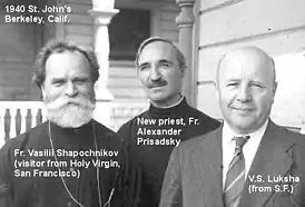 ![]() А. М. Присадский (в центре) с В. Шапочниковым и В. С. Лукшей из Сан-Франциско (1940 год, Беркли) | |