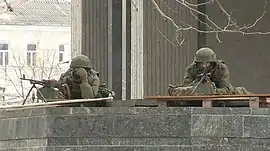 В ночь с 26 на 27 февраля российским спецназом[67][138][139][140] были заняты здания Верховного Совета и Совета министров АР Крым в Симферополе[141]. Также ранним утром 27 февраля были установлены блокпосты на Перекопском перешейке и Чонгарском полуострове, через которые осуществляется сухопутное сообщение между Крымом и материковой Украиной. Этот день ознаменовал начало активных и решительных действий России и пророссийских сил, закончившихся присоединением Крыма к РФ. Оценивая вероятного противника, специалисты Минобороны РФ имели в виду не только потенциал украинских ВС, но и возможное появление в Крыму активистов полувоенных формирований. В частности, имелась оперативная информация о размещении в Крыму группы «Правого сектора» и планах организации диверсий на объектах Черноморского флота. Ожидались также акции, рассчитанные на привлечение внимания мировых СМИ, — захват боевыми группами заложников и пленение российских военнослужащих[142].