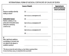 ВОЗ рекомендует различать непосредственную предварительную, первичную (основную) и внешнюю причины смерти[1]. В таком порядке они записываются в свидетельства о смерти.