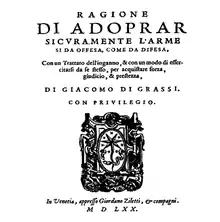 - Ragione di adoprar sicuramente l’arme si da offesa, come da difesa. Giacomo di Grassi, 1570