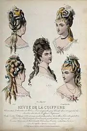 В 1870-е фасон женского платья меняется, юбки становятся уже, а плечи и шея в дневное время полностью скрываются под тканью, декольте и короткие рукава допускаются лишь в вечерних нарядах. Этот период в моде характеризуется стилем неорококо и подражанием моде XVIII века. Прически 1870-х — 1880-х годов замысловатые и высокие, зачастую для их создания требовались накладные локоны. Спереди и над висками волосы зачесывали высоко вверх для придания объема, на макушке укладывали в петли или косы, а сзади волосы обычно укладывались в сеточку или спадали длинными завитыми локонами на шею и спину. Модной тенденцией 1880-х были кудрявые и прямые челки.