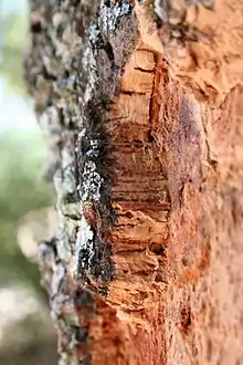 Молодые деревья обрастают неправильно растрескавшейся пробковой корой, которую впервые снимают примерно на 25 году жизни дерева. Для этого особым топором кору надрубают кругом и вдоль, а затем сдирают с помощью клинообразно заострённого конца топорища. Работу производят в июле и августе, избегая дней, когда дует сухой, знойный ветер, повреждающий обнажённую заболонь, которую необходимо сохранить. Первый сбор сырья практически не используется, так как оно распадается на небольшие куски (так называемая «мужская» пробка). Следующие слои, нарастающие через 6—9 лет после съёма, гораздо равномернее (так называемая «женская» пробка).