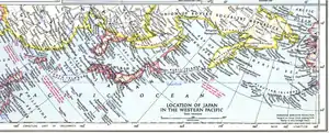 Вверху: Соглашение о вступлении СССР в войну против Японии Внизу: Карта Японии и Кореи, изданная Национальным географическим обществом США, 1945 г. Фрагмент. Подпись красным шрифтом под Курильскими островами гласит: «В 1945 г. в Ялте было согласовано, что Россия вернёт себе Карафуто (префектура Карафуто - южная часть острова Сахалин) и Курилы». |