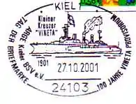Одноимённый большой крейсер кайзеровского военно-морского флота, введённый в строй в 1897 году, зимой-весной 1901 года находился в очередном трансатлантическом походе. В январе «Винета» пребывала в гавани Нового Орлеана, где по случаю дня рождения императора Вильгельма II был устроен большой совместный праздник для экипажа корабля (состоявшего из 465 человек) и местных жителей. Новоорлеанские газеты с описанием торжества достигли моряков лишь в Порт-оф-Спейне (Тринидад). Естественно, экипажу «Винеты» захотелось отослать их домой родным. Однако обнаружилось, что на крейсере отсутствует в достаточном количестве остро необходимая почтовая марка номиналом в 3 пфеннига для франкирования бандеролей.