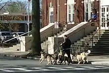 В США и Европе владельцы собак часто готовы платить профессиональным выгуливателям собак, как частным лицам, так и организациям. Некоторые выгуливатели выводят на прогулку сразу несколько собак, другие — только одну.[4] Продолжительность прогулки может варьироваться в зависимости от породы или запроса владельца, от коротких лёгких прогулок до более длительных с определённым временем, установленным владельцем. Продолжительность прогулки также должна определяться возрастом собаки. Продолжительные прогулки (более 1 часа) не следует предлагать собакам младше 12 месяцев для мелких пород и младше 18 месяцев для крупных, чтобы не перегружать их кости и суставы в период роста. Также набирает популярность «собачий бег». Собачьи бегуны — это профессионалы, которые бегают с собаками, а не гуляют с ними. В некоторых юрисдикциях предприятия по выгулу собак должны иметь лицензию и сотрудников, обученных оказанию первой помощи животным. Профессиональные услуги по выгулу собак можно получить на месте или через справочные онлайн-службы. Получить должность профессионального выгуливателя собак стало сложнее, соискателям необходимо сдавать строгие экзамены и проходить обширную подготовку.[7] Однако, независимо от того, требуется ли лицензирование или обучение, все собаководы, выгуливающие собак других людей, должны знать о передовых методах, таких как использование поводка фиксированной длины, а также учитывать погодные условия.
