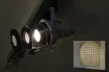 Предназначенный для проецирования на экран прибор (если не имеет специального названия) называется проектором. Осветительный прибор, который направляет фокальные лучи в одну точку на оптической оси системы, также называется проектором.[8] Он может использоваться как часть аппарата, предназначенного для создания изображения на экране. Осветительный прибор в этом случае используется для концентрации светового потока на рисунке или диапозитиве, отображаемого объективом на экране. Технологические проекторы используются для лучистого нагрева объектов.[9]