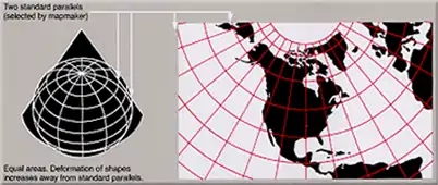 Проекция Альберса принята для изображения Британской Колумбии[1]. Она также широко используется Геологической службой США и Бюро переписи населения США[2].