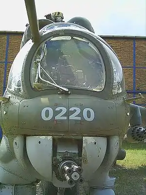 Вместе с тем, прозрачная броня используется для защиты экипажей боевых вертолётов, действующих в зонах досягаемости огня автоматического пехотного оружия. В 1971 году в СССР на вооружение принят транспортно-боевой вертолёт Ми-24[13]. Фонари кабин Ми-24 состоят из боковых панелей двойной кривизны из оргстекла и плоских лобовых пулестойких стеклоблоков. Широкие лобовые бронеблоки обеих, расположенных тандемом, кабин экипажа вместе со стальной бронёй кабины толщиной 4—5 мм защищают переднюю проекцию штурмана-оператора и пилота вертолёта от 7,62-мм пуль пехотного оружия. Прозрачная броня применяется для защиты кабины современных ударных вертолётов Ми-28 и Ка-50, передние и боковые окна которых выполнены из броневых стеклоблоков. По данным разработчиков, обеспечивается защита указанных машин от бронебойных пуль калибра 12,7 мм и 20-мм снарядов. Кабина бронированного штурмовика Су-25 с передних направлений обстрела также защищена прозрачным бронеблоком ТСК-137 толщиной 65 мм.