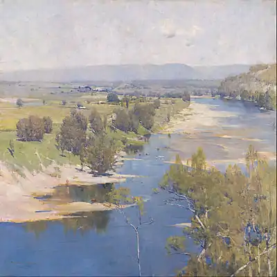 Каждое прикосновение здесь уверенно и актуально для персонажа. Нет рисования влажным цветом, нет возни с неопредёленным, и все же в этой точности прикосновения живёт тайна ценности и света, более глубокая, чем любая романтическая формула уклонения от рисования… Кто кроме Стритона, глядя на реку Хоксбери с террасы через эти далеко раскинувшиеся равнины, может представить, что он видел? Чтобы угадать возможности картины, её формы и освещение, её характер и композицию в этом широком поле, требуется гениальная интуиция.