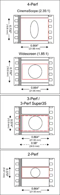 Формат «Супер-35» (англ. Super-35, Superscope-235), использует 35-мм киноплёнку, стандартный шаг кадра, но его кадр занимает всю ширину между перфорациями, в том числе пространство, в прокатных форматах резервируемое для оптической фонограммы[4]. Этот формат почти точно соответствует киноплёнкам немого кинематографа, с той разницей, что при печати используется не вся высота кадра, а его часть, высота которой зависит от требуемого соотношения сторон изображения. Разновидности формата «Супер-35» с шагом в 3 и 2 перфорации требуют специального грейферного механизма камеры. Такой шаг кадра позволяет экономить киноплёнку и особенно популярен при цифровой технологии с последующей цифровой обработкой отсканированного негатива, поскольку не допускает физическую склейку монтажных кусков из-за чрезвычайно узкого межкадрового промежутка.