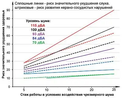 У людей, работающих в условиях воздействия интенсивного шума, чаще наблюдается гипертоническая болезнь сердца, коронакардиосклероз, стенокардия, инфаркт миокарда.[16] Жалобы на боли в сердце, сердцебиение и перебои обычно возникают не при физической нагрузке, а в покое и при нервно-эмоциональном напряжении. Данные о влиянии шума на артериальное давление противоречивы — у части людей оно снижается, а у части — повышается. По мере увеличения стажа частота гипертензивных состояний нарастает. Отмечалось изменение тонуса кровеносных сосудов, особенно капилляров, уменьшение кровотока. По данным ЭКГ у рабочих, подвергающихся чрезмерному воздействию шума, нередко обнаруживали функциональные нарушения миокарда, барикардию, синусовую аритмию и др. Изменения в сердечно-сосудистой системе наблюдались у рабочих, у которых отсутствовали признаки кохлеарного неврита. По данным[17] при увеличении уровня шума на 1 дБА скорость прироста потерь слуха в 3 раза выше, чем нервно-сосудистых нарушений, и они составляют 1.5 и 0,5 % на каждый децибел уровня воздействующего шума.