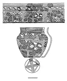 Для орнаментации плечиков и боковин чаще используются валиковые треугольные, зигзагообразные и фестончатые фигуры с включением налепных шишечек. Графическая реконструкция одного сосуда иллюстрирует сложный мифологический сюжет из выделенных валиков, расчлененных вертикальными зонами из елочек, ромбов, крестов и лопастей. Внешняя часть днища этого сосуда украшена крестообразным знаком.