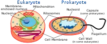 Единственная крупная кольцевая (у некоторых видов — линейная) двухцепочечная молекула ДНК, в которой содержится основная часть генетического материала клетки (так называемый нуклеоид), не образует комплекса с белками-гистонами (так называемого хроматина). К прокариотам относятся бактерии, в том числе цианобактерии (синезелёные водоросли), и археи. Потомками прокариотических клеток являются органеллы эукариотических клеток — митохондрии и пластиды.