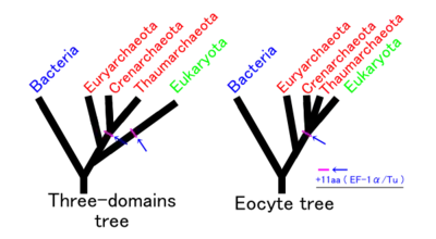 Другие утверждают, что три области жизни возникли одновременно, из набора разнообразных клеток, которые образовали единый генофонд. Это противоречие было обобщено в 2005 году:[33]