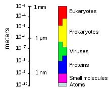 Большинство прокариотических клеток очень малы по сравнению с эукариотическими клетками. Типичная бактериальная клетка имеет размер около 1 мкм, тогда как эукариотические клетки имеют большой размер от 10 до 100 мкм. Типичная прокариотическая клетка примерно такого же размера, как эукариотическая митохондрия.