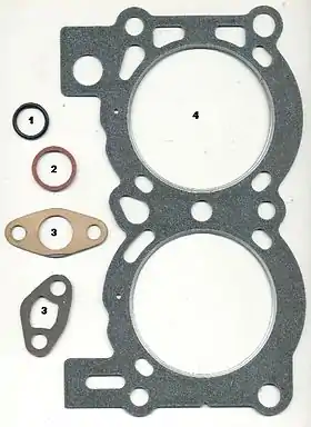 - Композитные (устаревшая технология). Обычно построены на асбесто-графитовой основе. Газовый стык имеет стальные кольца, ходы герметиком не окантованы[3].