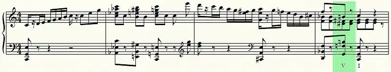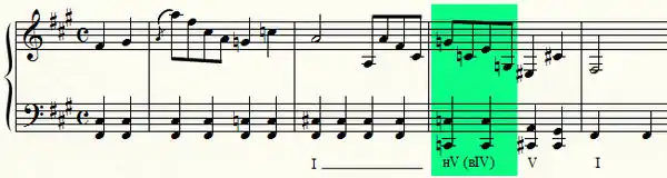 - См., например, знаменитый марш (из «Детской музыки») C-dur op. 65 № 10, т.17 (верхняя атакта к двойной доминанте es/ges/b сочетается с доминантовым басом G и разрешается в d — основной тон двойной доминанты).