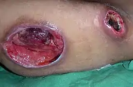 Степень III: разрушение кожного покрова вплоть до мышечного слоя с проникновением в мышцу. Пролежень выглядит как рана. Могут быть жидкие выделения.