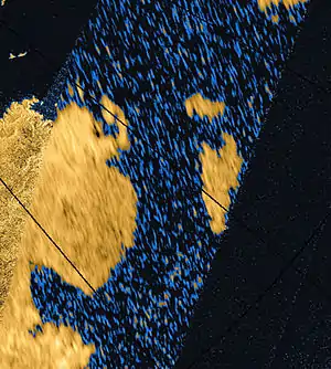 Пролив Бейты на радиокарте северного полюса Титана (псевдоцвета)