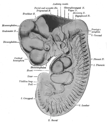 На этой стадии в развивающемся головном мозге эмбриона формируются три отдельных утолщения с полостями внутри, наполненными жидкостью (прообразом будущей спинномозговой жидкости) — три первичных мозговых пузыря. Самый передний называется передним мозгом, или прозэнцефалоном. Средний называется средним мозгом. Самый задний, имеющий форму, напоминающую ромб, называется ромбовидным мозгом.