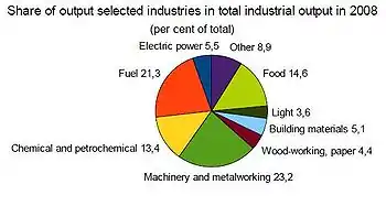 - Производство продуктов нефтепереработки и кокса — доля 12,8 %, 34 предприятия, занято 12,8 тыс. сотрудников (1,4 %);