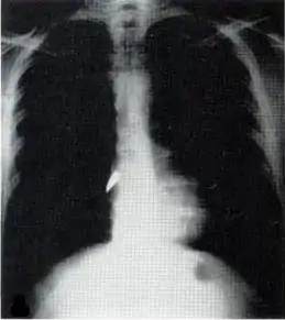 Рентгеновский снимок, показывающий пулю (белое пятно) в сердце
