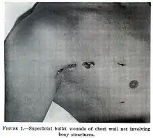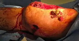 Свежее проникающее ранение колена причинённое выстрелом из ружья с близкого расстояния (Взрывное ранение). Дробинки из ружейного патрона видны в ране, внутри раздробленного надколенника. Комок пороха из гильзы был извлечен из раны и виден в правом верхнем углу изображения. | |