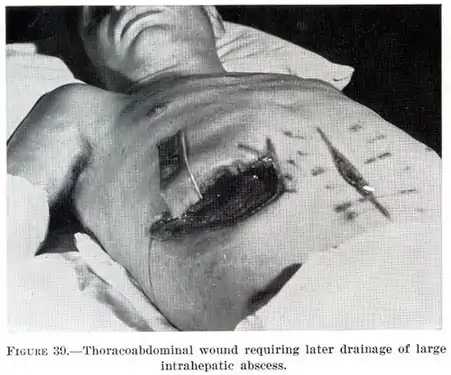 Торакоабдоминальная рана, требующая последующего дренирования большого внутрипечёночного абсцесса
