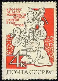 Почтовая марка СССР с призывом, обращённым к юным пионерам.