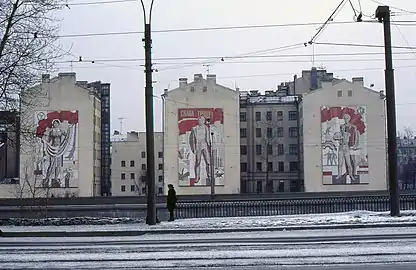 Транспаранты на брандмауэрах. Ленинград, набережная Обводного канала, 1984 г.