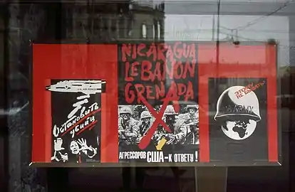 Антивоенный антиамериканский плакат в витрине центрального почтамта. Москва, 1984 г.