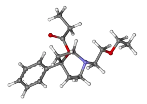 Систематическое название — 1-(2-этоксиэтил)-4-фенил-4-пропионилоксипиперидина гидрохлорид[1]. Химическая формула — C18H27NO3[1]. Был синтезирован на основе 1-(3-этоксипропил)-4-оксопиперидина[3]. Представляет собой легкорастворимый в воде кристаллический порошок белого цвета с жёлтым оттенком[1].