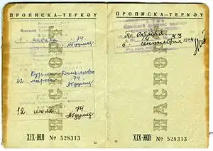 Доля населения, подлежащая паспортизации, постепенно расширялась и в 1974 году распространилась на всех граждан Советского Союза. Положением о паспортной системе СССР 1974 года[13] был установлен порядок, при котором гражданин, изменивший место жительства или выбывший в другую местность на временное проживание на срок свыше полутора месяцев, обязан был выписаться перед выбытием (подтвердив наличие жилплощади на новом месте), а при прибытии на новое место подать на новом месте заявление с согласием лица, предоставляющего жилую площадь. Исключение составляли командировки, каникулы, выезды на дачу, отдых или лечение. На все действия по выписке и прописке, включая личные посещения государственных учреждений, гражданину отводилось три дня. При этом власти имели право немотивированно отказать в прописке на новом месте, после чего гражданину предписывалось в 7-дневный срок выбыть из соответствующего населённого пункта. Находиться без прописки на любой территории СССР запрещалось.